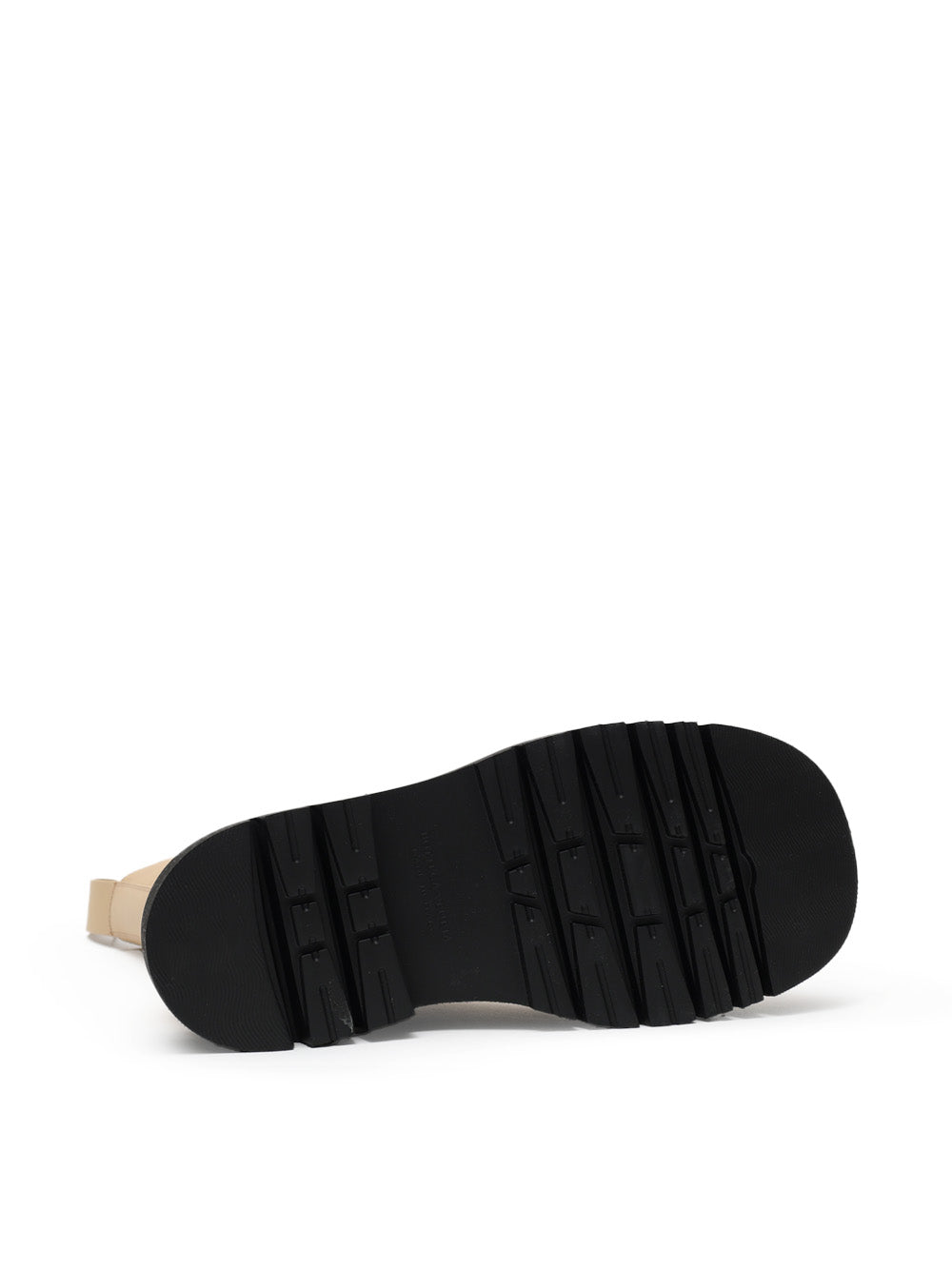 Stivaletti Lug in Pelle Beige e Nera Bottega Veneta. Maxi suola a carrarmato in nero, punta tonda, pelle spazzolata, sui lati bande elastiche a contrasto, linguette calzascarpe sul fronte e retro per indossarli comodamente.