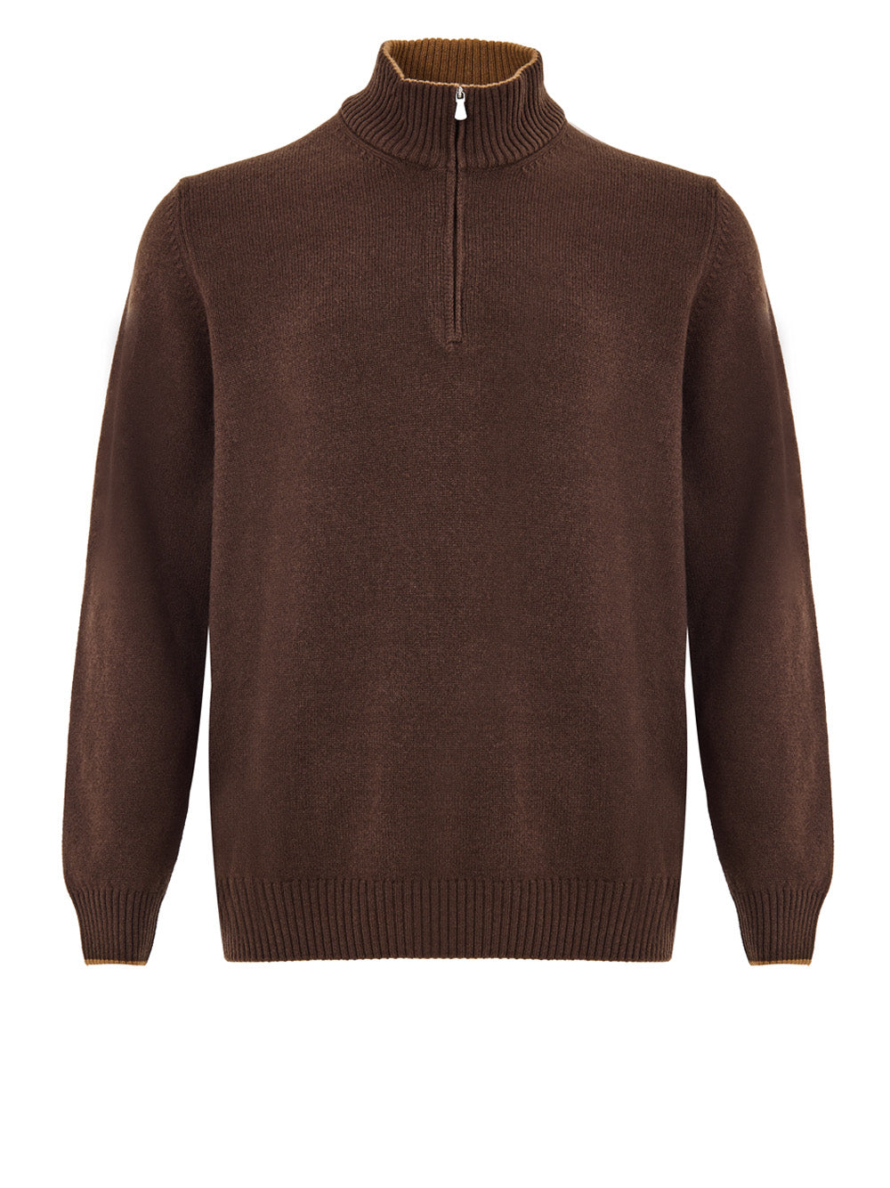 Maglione Lupetto con Mezza Zip in Lana Marrone Gran Sasso. Linea classica, chiusura con mezza zip, interno del colletto a contrasto.