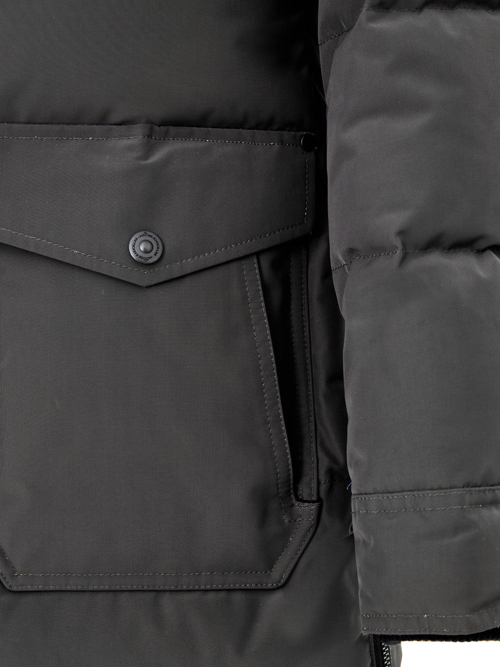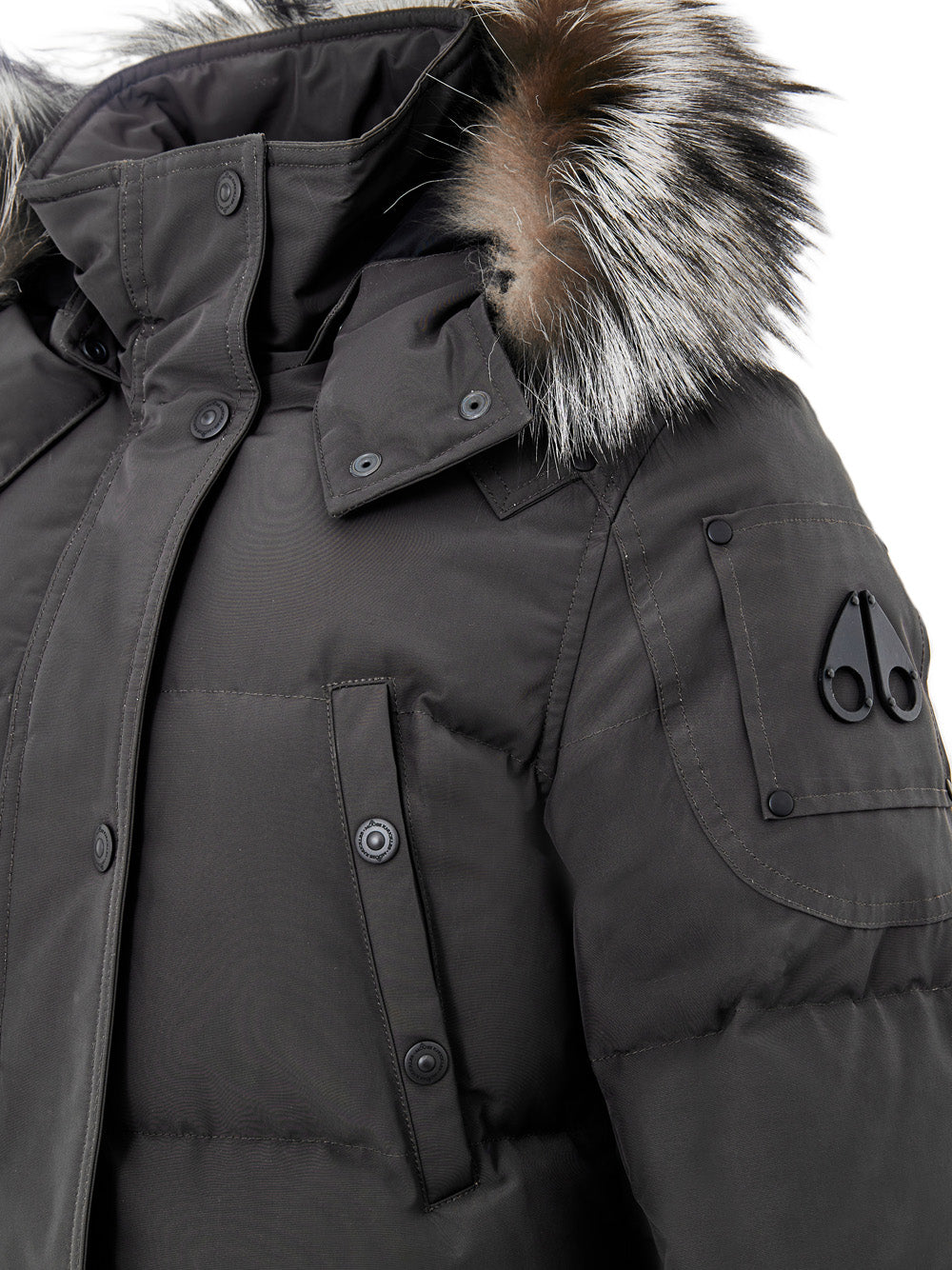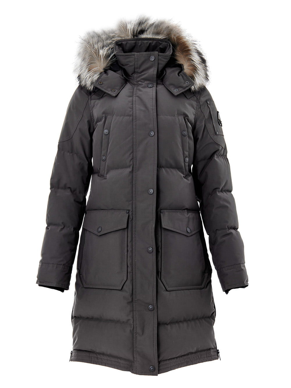 Giubbino Lungo Imbottito in Grigio Moose Knuckles. In tessuto tecnico grigio, imbottitura interna, allacciatura frontale con zip e bottoni, due tasche frontali con patta, due tasche laterali a filetto, logo metallico gommato applicato sulla manica. Collo alto chiuso con bottoni, cappuccio con pelliccia regolabile e removibile, sui fondo zip ai lati. Tasche interne, foderato