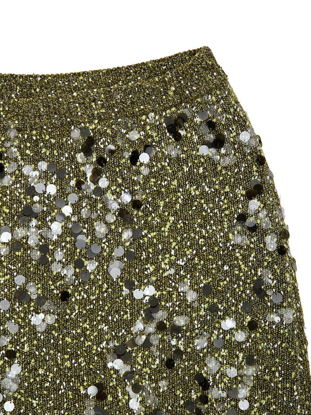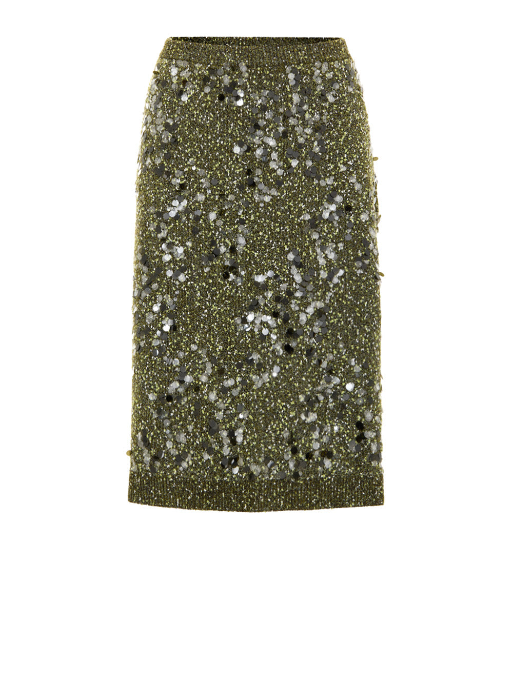 In Militärgrün, Strickware, elastischer Bund, Schlauchform, über dem Knie lang. Mehrfarbige Paillettenapplikationen.