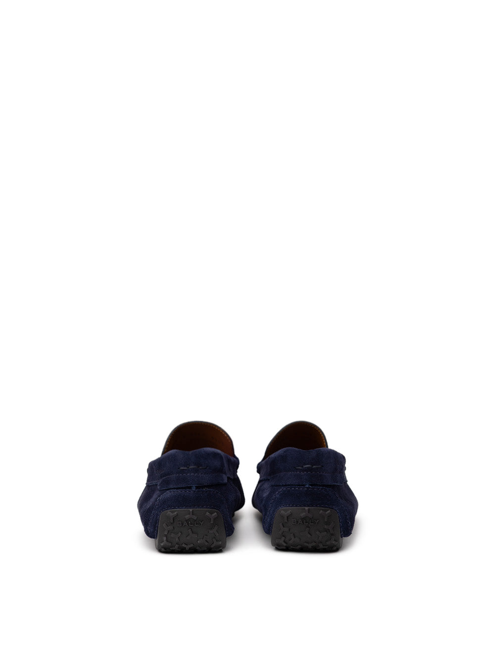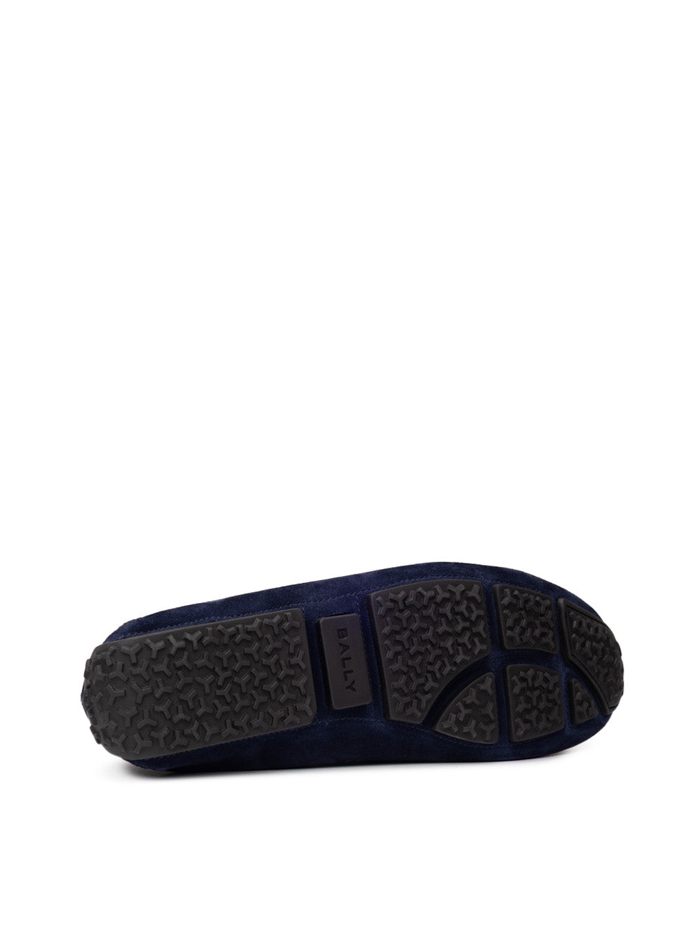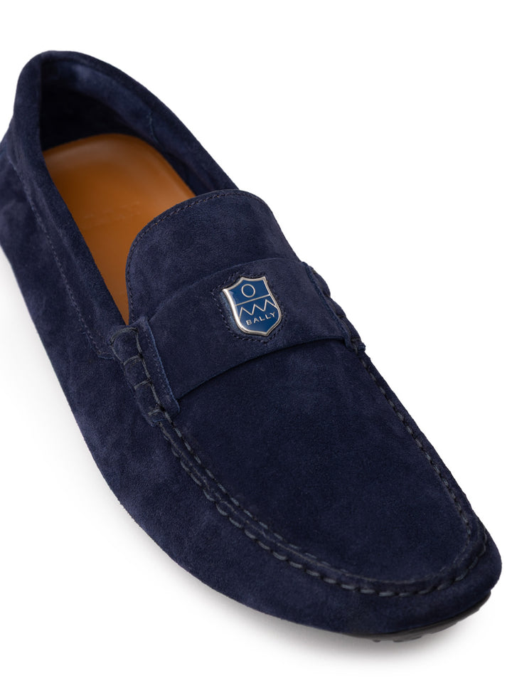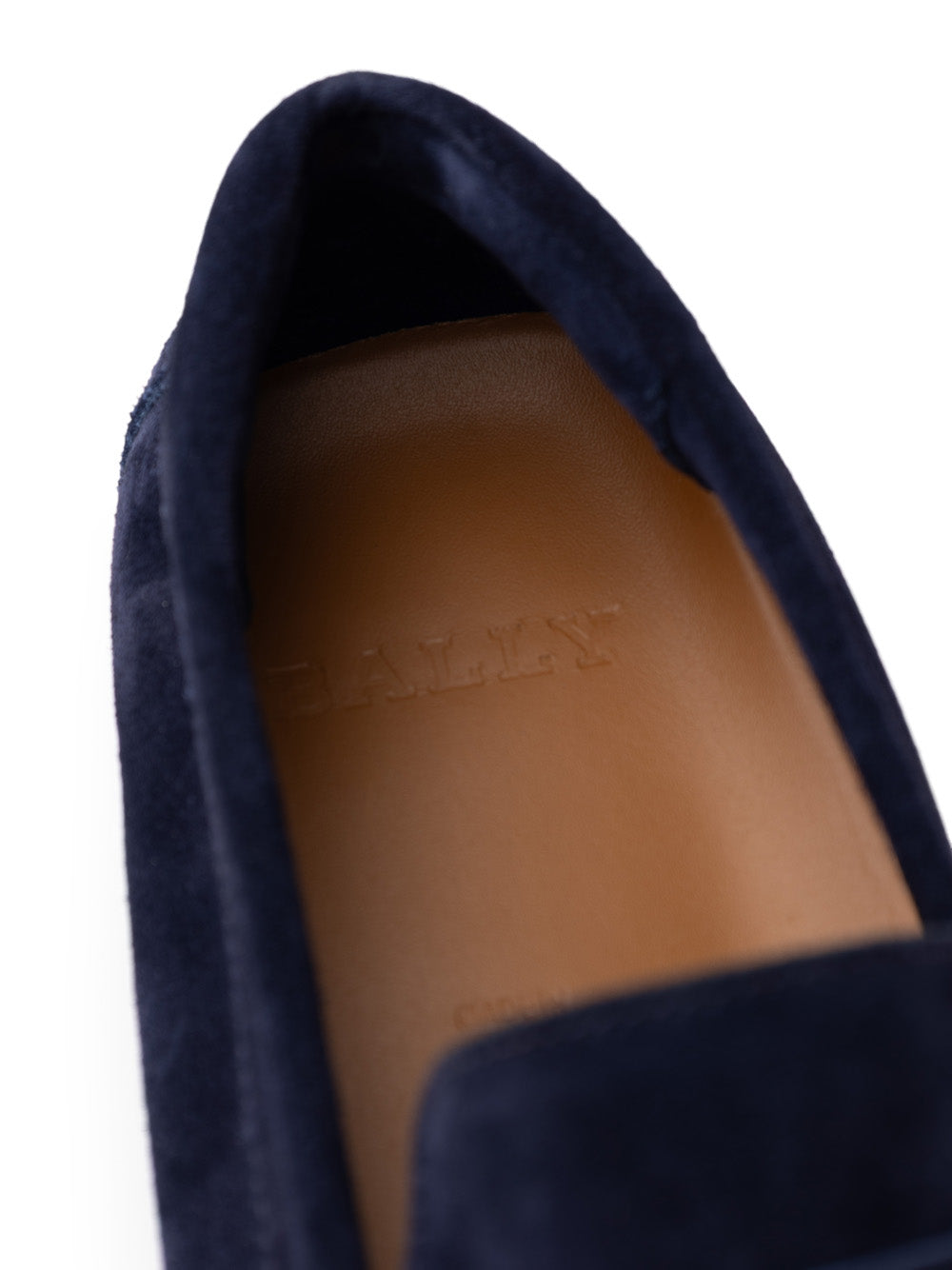 Bally Blaue Wildleder-Loafer mit Logo. Hergestellt aus blauem Wildleder, mit mandelförmiger, runder Zehenpartie, Marken-Innensohle und metallischer Logo-Applikation. Die segmentierte Gummilaufsohle. Größe 8,5 EU - 43 IT