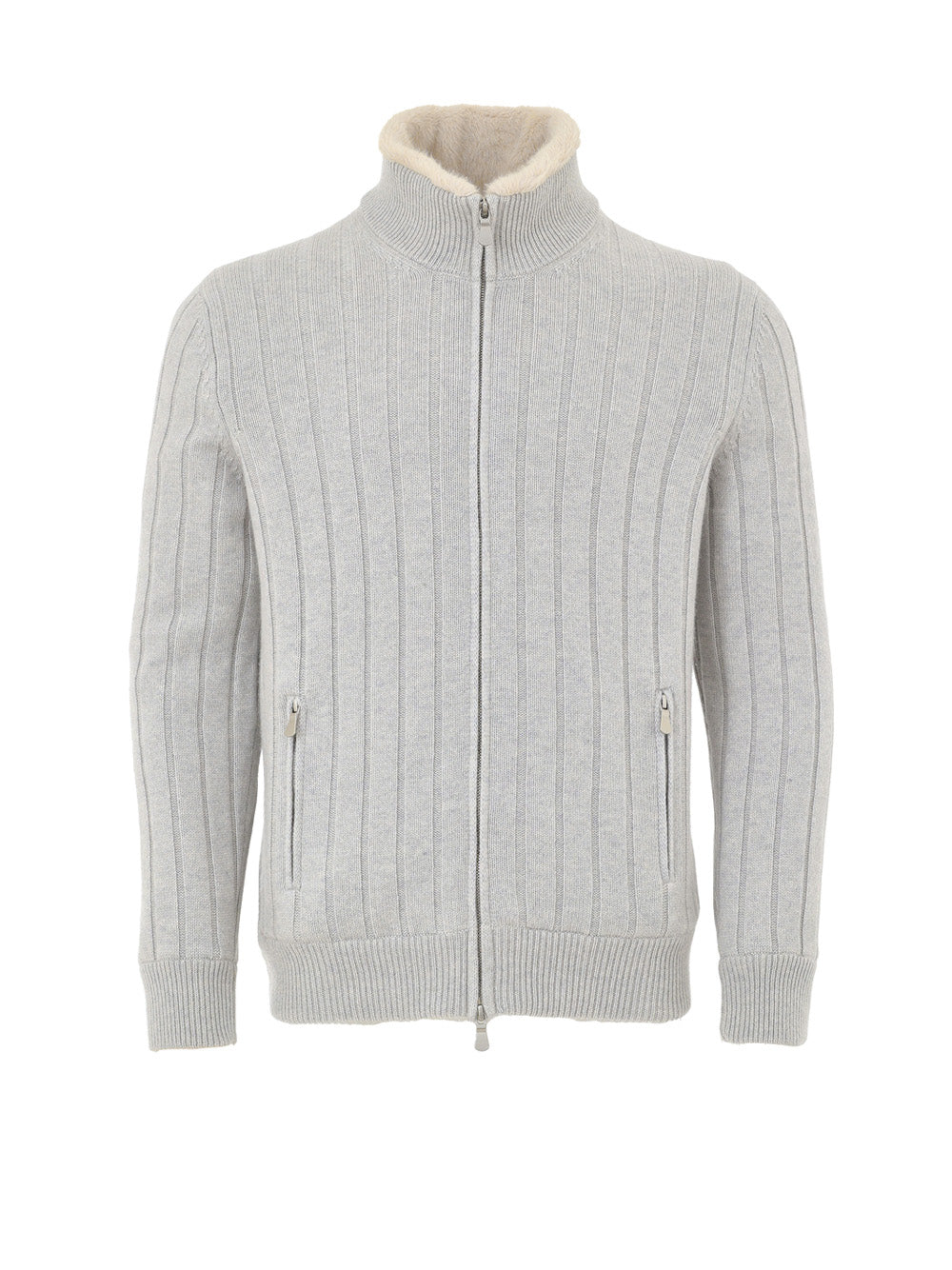 Maglione con Zip Grigio in Lana ed Eco Fur Gran Sasso. Lavorazione a costine, allacciatura frontale con zip, due tasche laterali chiuse con zip, collo lupetto a costine. Internamente eco fur bianca con dettaglio sul collo. Maniche foderate