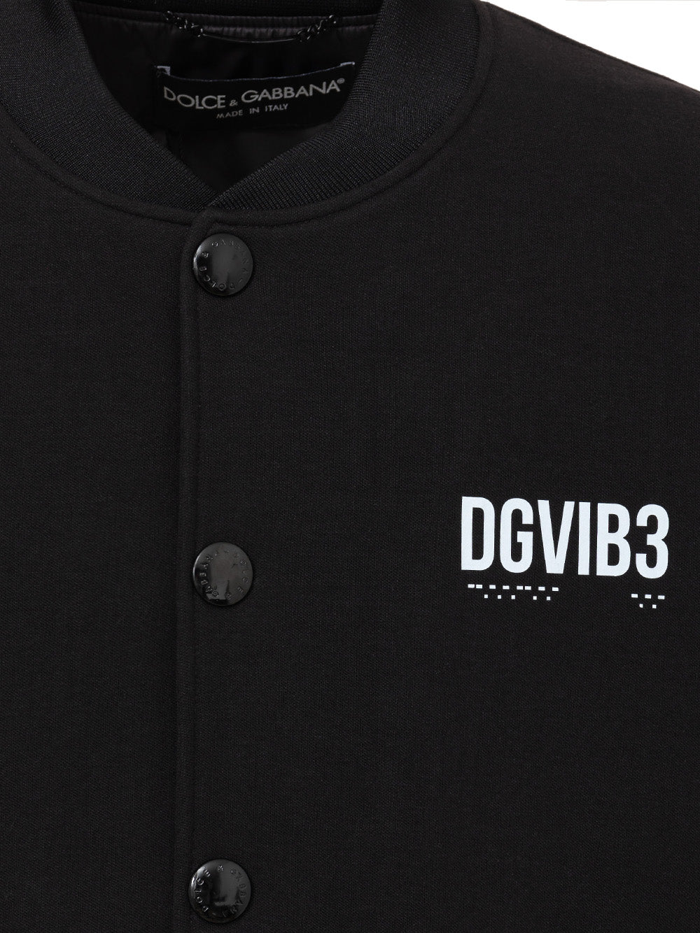 Black Fabric Bomber Jacket DGVIB3 Dolce & Gabbana. Front fastening with tone-on-tone metal snaps, two side welt pockets, contrasting logo print on the back. Lightly padded, internal lining. Composition: 69% Viscose, 25% Polyamide, 6% Elastane. Lining: 100% Polyester. Internal SKU: 25FEB61. Brand SKU: G9ABAT GF796