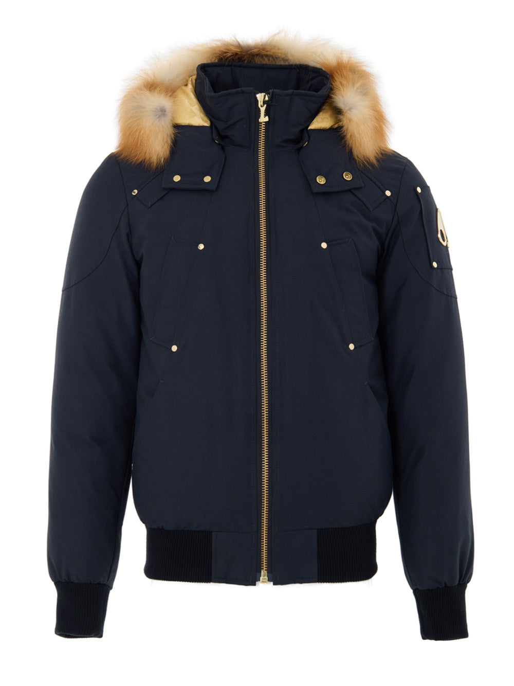 Giubbino Bomber Blu Imbottito Moose Knuckles. Allacciatura frontale con zip, due tasche laterali e due superiori a filetto, fascia in maglina elastica in vita e polsini, cappuccio regolabile e removibile con inserto in pelliccia. Sulla manica patch in tessuto e logo metallico applicato. Fodera interna gold, dettagli metallici in gold.