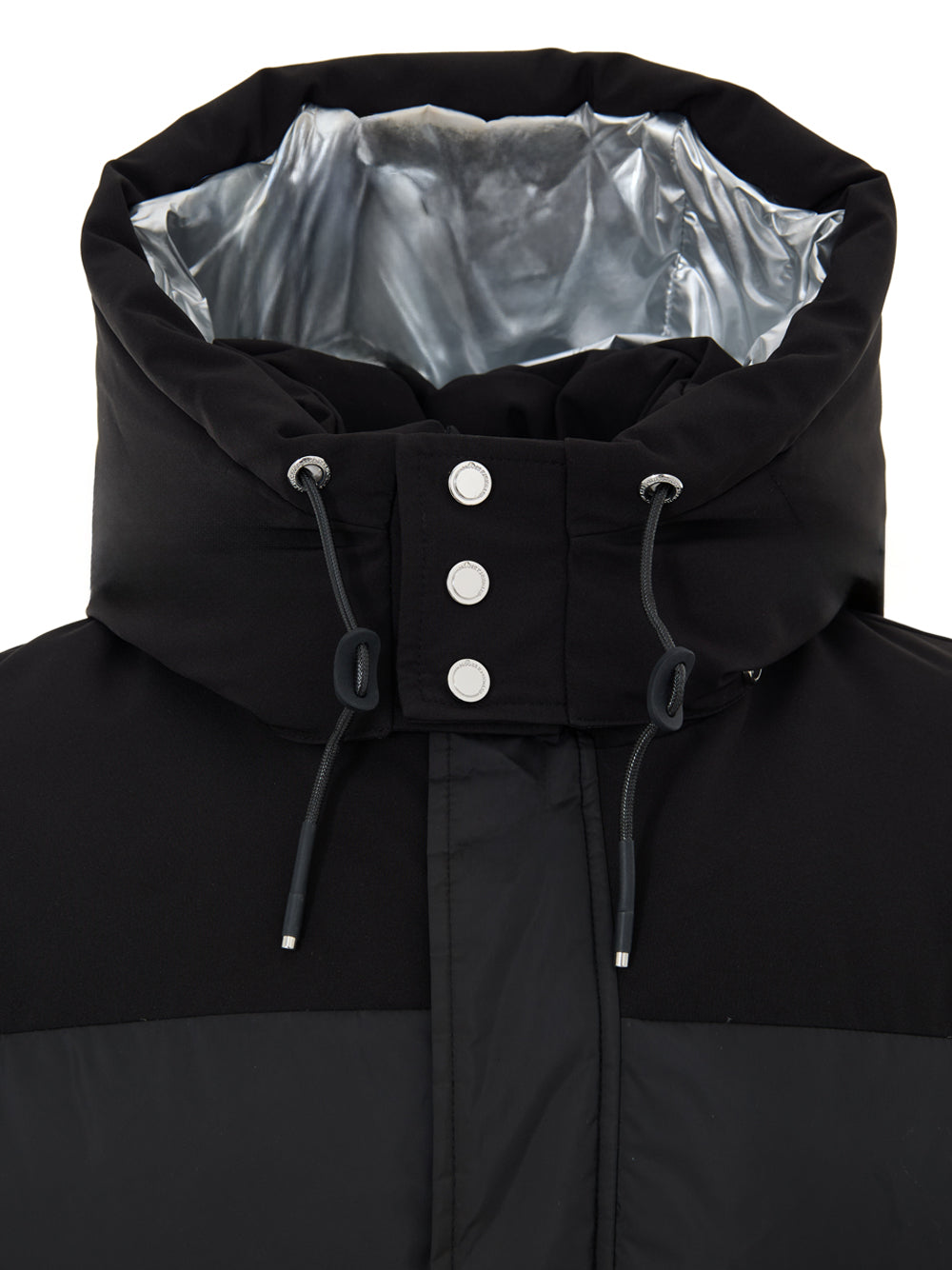 Giubbino Imbottito con Cappuccio in Nero Moose Knuckles. Allacciatura frontale con zip e bottoni coperti, due tasche laterali chiuse con zip, cappuccio regolabile e removibile con contrasto silver nella parte interna. Parte interna in silver, taschino con zip. Sulla manica patch con logo applicato.