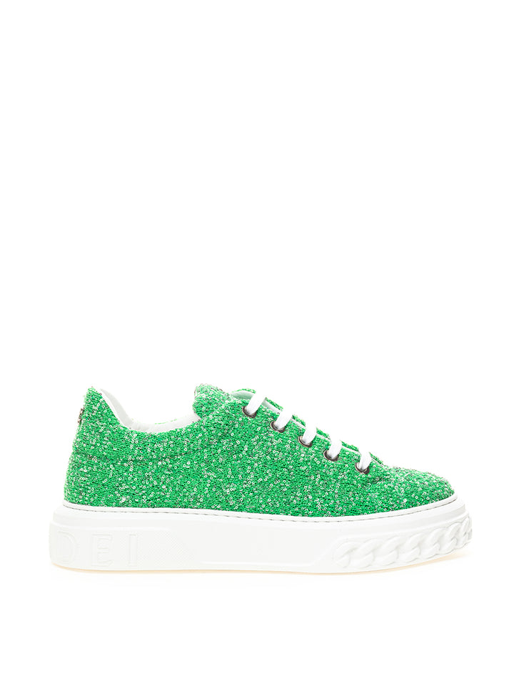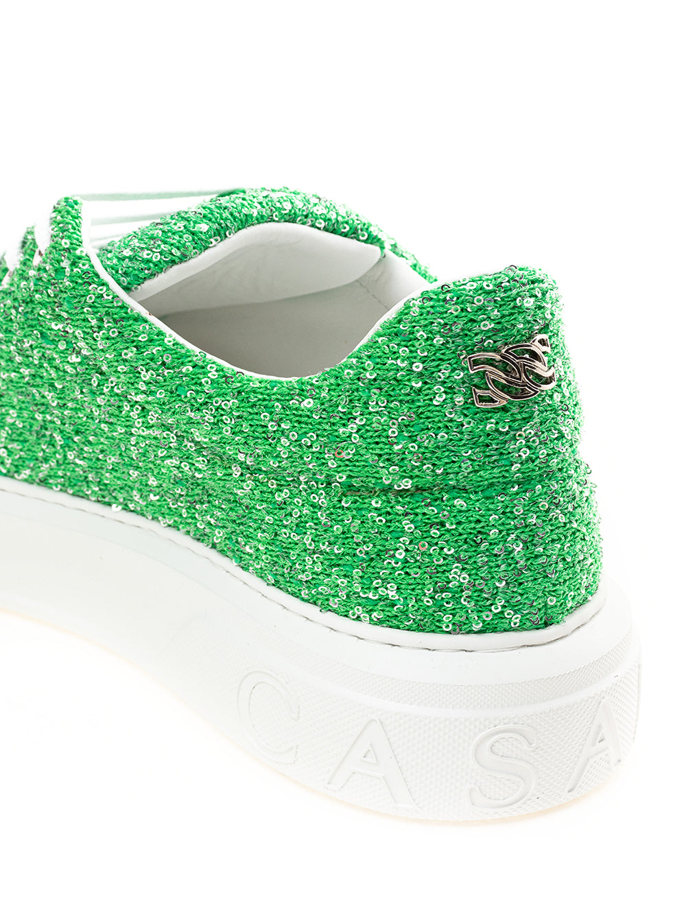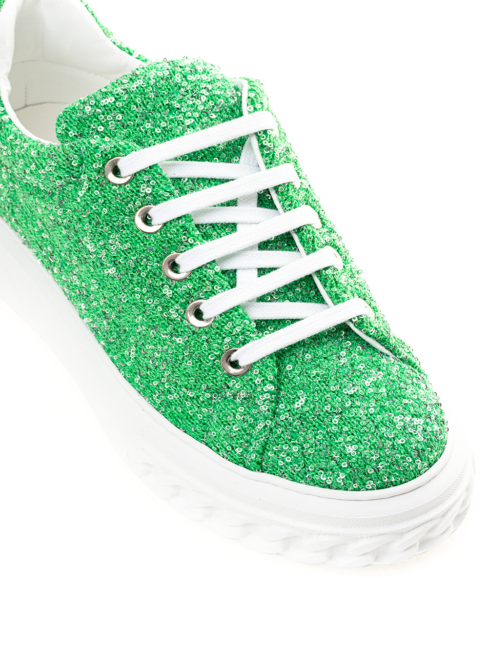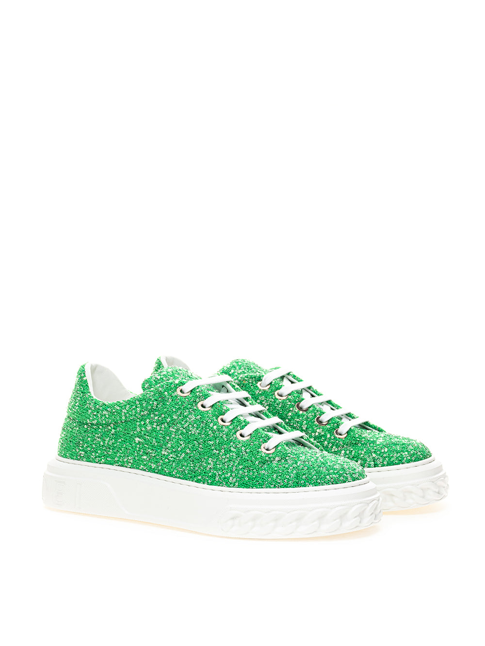 Green Sneakers Casadei Off Road Disk. Lighting with white laces, white rubber sole with bas -relief chain and logo printed on the back. Tomo in green topazio fabric of jersey with All over applied sequins. Side height: 4 Cm-Sku Internal: 24AP176