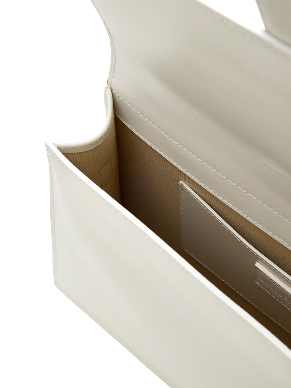 Borsa Le Bambino Over Size in Pelle Bianca Jacquemus. Modello a spalla con tracolla regolabile e removibile, manico singolo, apertura frontale con patta e bottone magnetico coperto, unico scomparto interno e taschina, logo metallico gold applicato sul lato. Tasca applicata sul lato posteriore