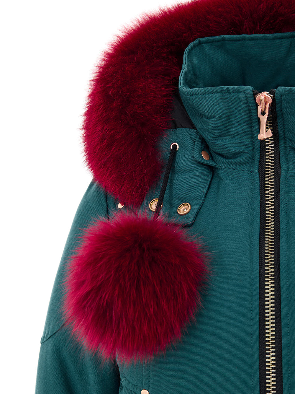 In tessuto verde petrolio, imbottitura interna, allacciatura frontale con zip, fascia elastica tono su tono, due tasche laterali a filetto e due micro tasche sulla parte superiore. Cappuccio regolabile e removibile con rifinitura in pelliccia rossa a contrasto, tiranti con pompom in pelliccia, logo applicato sulla manica.