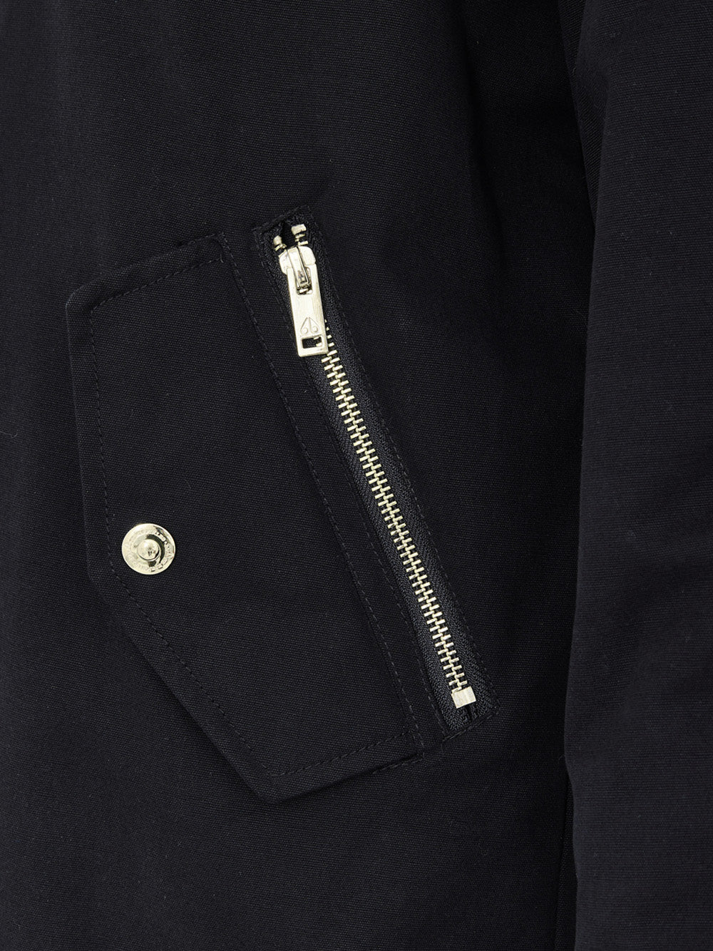Giubbino Middle Parka in Tessuto Verde con Pelliccia Moose Knuckles. Media lunghezza, apertura frontale con zip, due tasche laterali con patta chiuse con bottone e zip a vista, maxi zip sul lato, imbottitura interna, cappuccio con inserto in pelliccia regolabile e removibile. Sulla manica patch con logo metallico applicato. Parte posteriore piu lunga con coulisse.