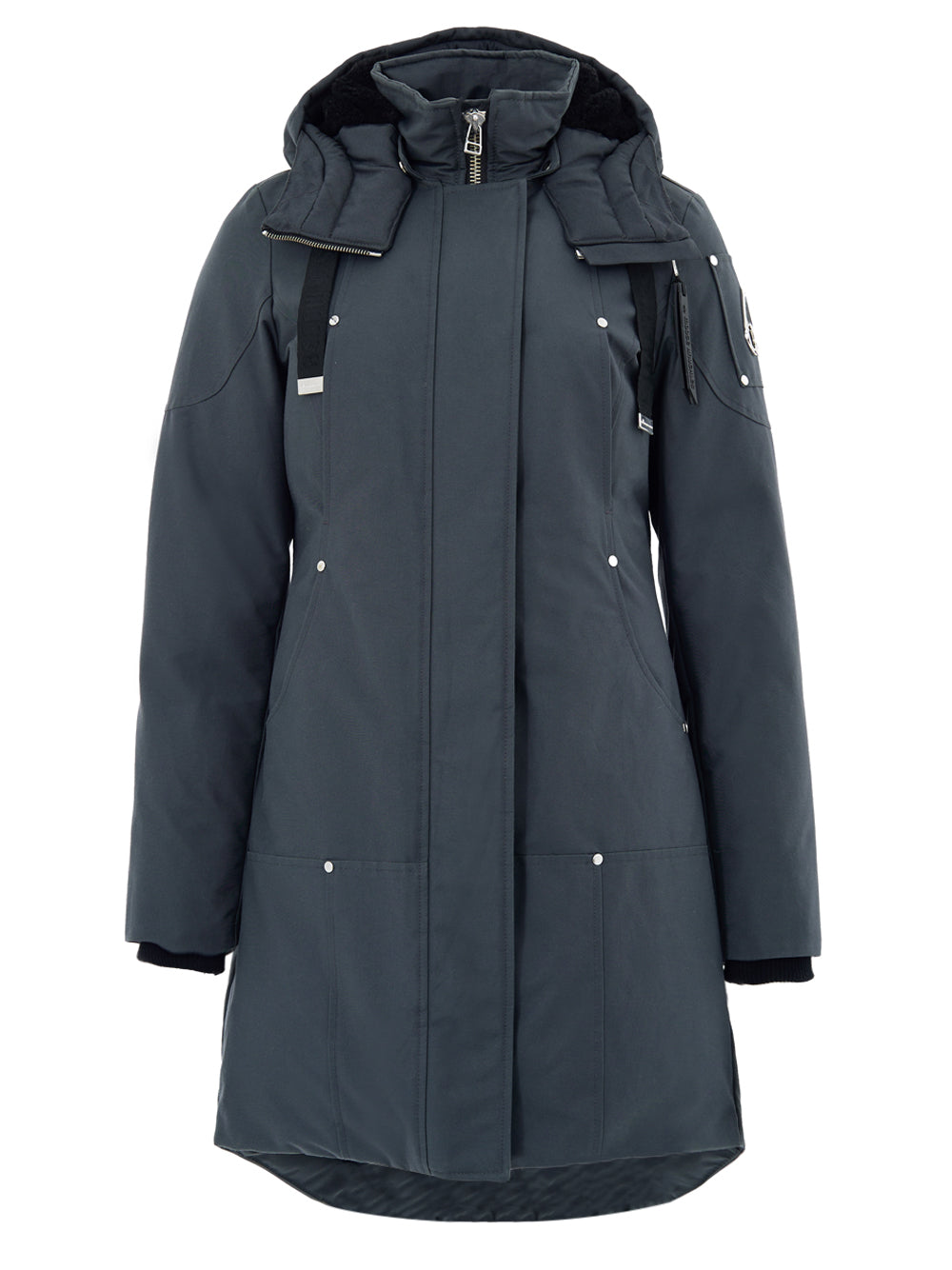 Parka Grigio con Cappuccio Moose Knuckles. Allacciatura frontale con zip e bottoni coperti, due tasche laterali a filetto, imbottitura interna. Cappuccio con inserto in pelo nero, regolabile e removibile. Sulla manica patch con logo metallico applicato. Composizione: 74% Nylon, 26% Cotone