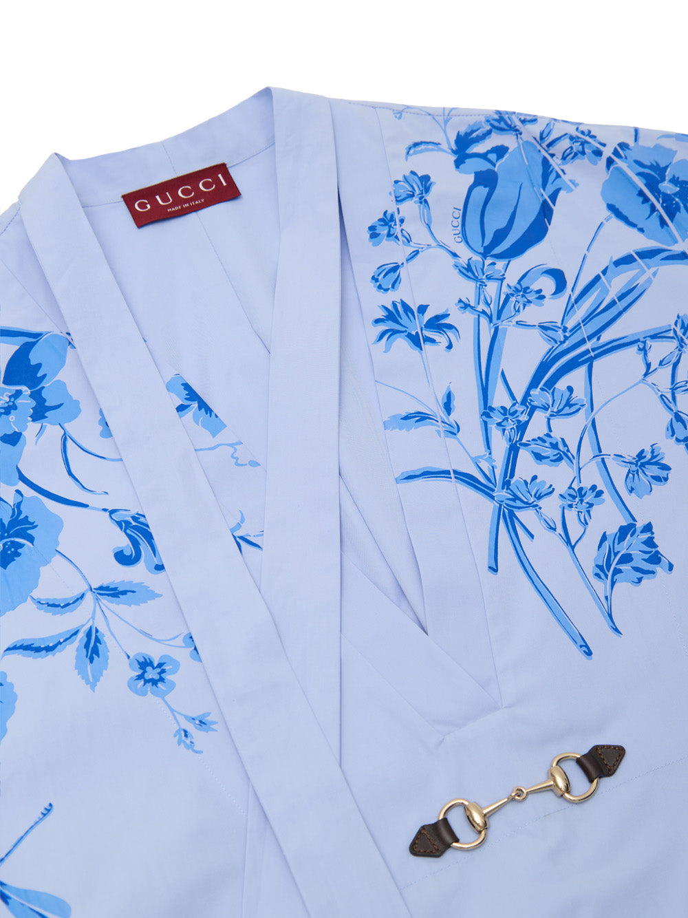Camicia Kimono in Popeline di Cotone Azzurra con Stampa Fiori Gucci.