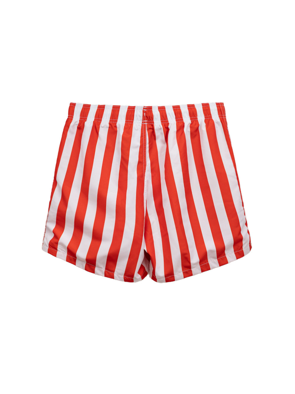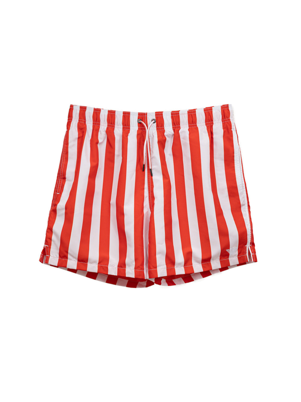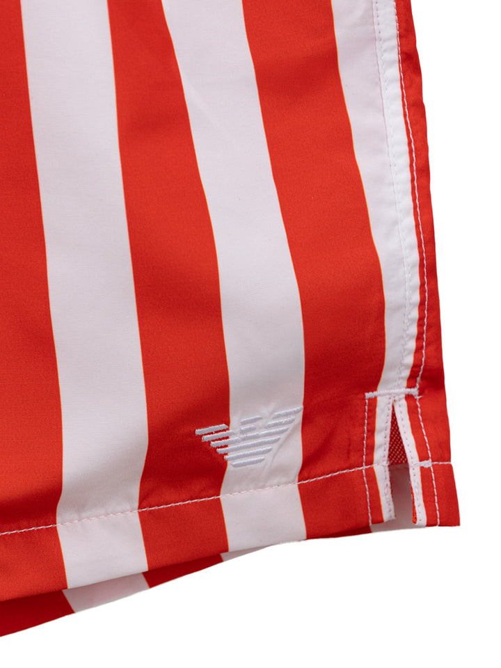 Costume Boxer a Righe Rosse Emporio Armani. Righe bianche e rosse allover, elastico in vita con coulisse in vita regolabile, due tasche laterali a filetto, fodera micro rete interna.