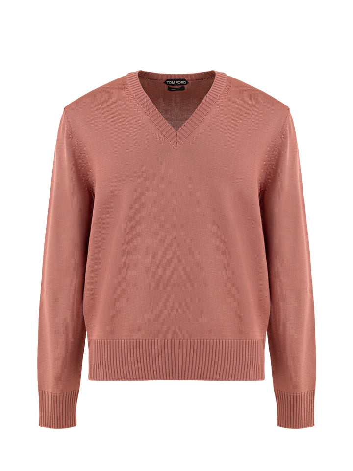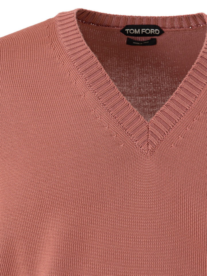 Maglione V-Neck Tom Ford. In rosa antico, effetto lucido, morbido al tatto, lavorazione maglia al collo, polsini e in vita. Vestibilità slim.